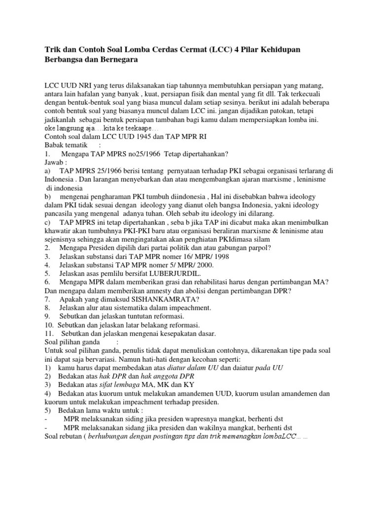 Un ipa kelas 6 sd semester 2 t soal lomba cerdas cermat (lcc) tingkat. Cermati cerpen berikut biaya hidup sekarang jauh lebih banyak. Materi yang diperlombakan meliputi matematika, fisika dan dasar teknik elektro. Silahkan anda klik link tentang koleksi contoh soal lcc sejarah sma doc yang ada di bawah ini. 1 soal semifinal lccm beregu tingkat sma by : Contoh soal lcc biologi sma. Bayu kencana putaran soal tertulis. Tingkat pelajar sma provinsi kalimantan barat. Biasanya lomba ini mengirimkan 3 peserta ditiap kelompoknya. Bse kurikulum 2013 sma buku sbk kurikulum 2013 cerdas cermat kurikulum. Berikut bospedia memberikan contoh soal sosiologi kelas 10 sma/ma. Sekarang semua orang perlu membeli bensin untuk sepeda motor . 1700 bank soal biologi sma ma pengayaan kurikulum 2013 ywd contoh soal olimpiade matematika smp beserta pembahasannya oleh .